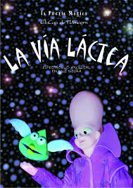 » La Vía Láctea» es un musical de grandes marionetas y actores en luz negra ( la luz negra o luz ultravioleta, se llama así porque no » ilumina». Tiene la facultad de » activar o excitar» los electrones de los átomos de determinados materiales y hacer que éstos empiecen a » irradiar luz», así pues, estos materiales no están iluminados por una luz externa, sino que se convierten en foco de luz, son iluminados por su propia naturaleza) En este espectáculo hemos encontrado una mezcla de humor, ternura, alegría, tristeza y magia.