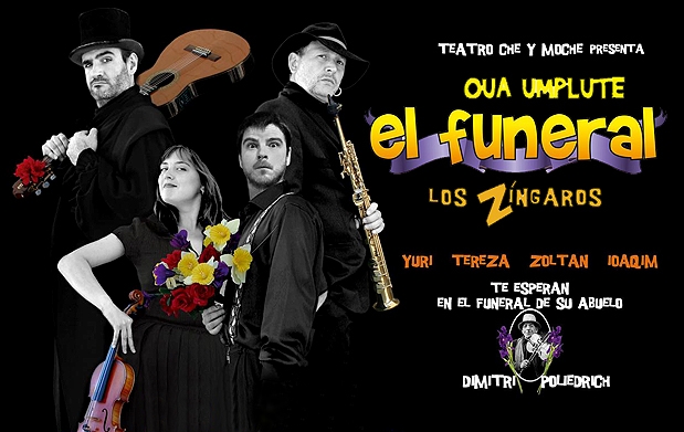 SINOPSIS: Un grupo de músicos zíngaros que invitan al público a celebrar el funeral de su abuelo Dimitri, una sencilla trama que convertirá todo en un lío lleno de situaciones increíbles. Unos personajes explosivos, el virtuosismo musical y la interacción con el público hacen de este funeral una increíble fiesta difícil de olvidar.