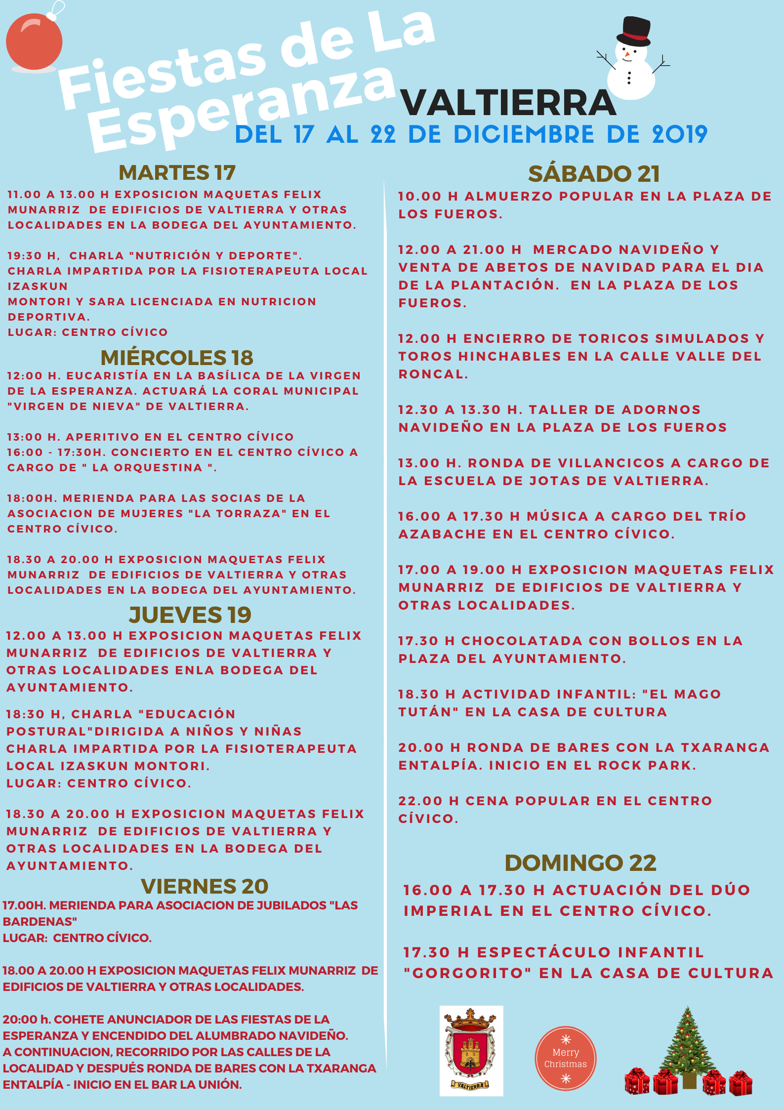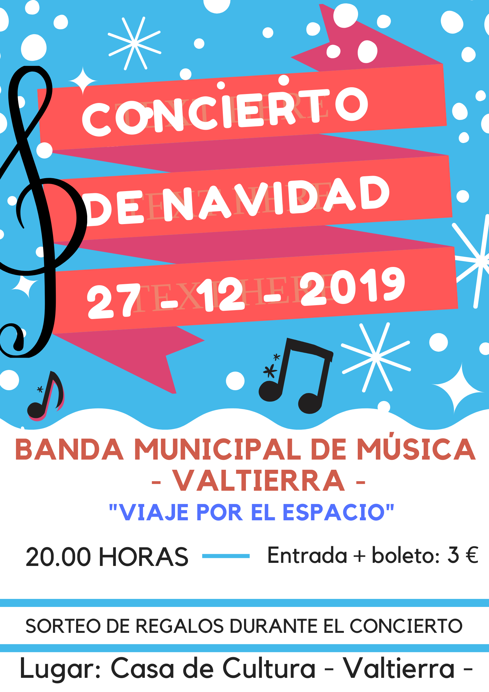 Concierto de Navidad de la banda municipal de música de Valtierra a las 20.00h en la Casa de Cultura de Valtierra. Entrada 3 €. Con la entrada se entregará un boleto para el sorteo de Navidad.